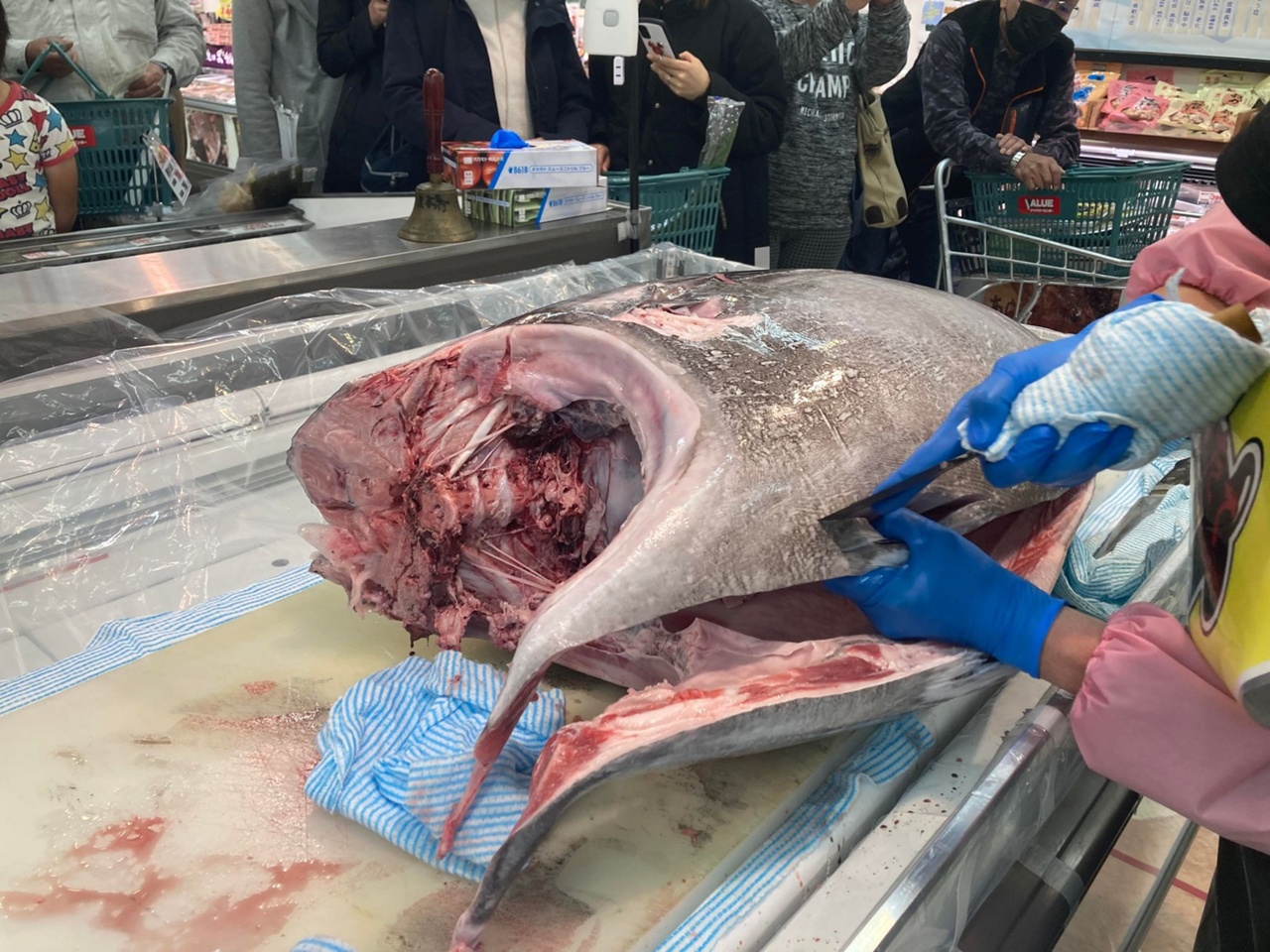 12月11日は、月に一度の魚の日。 毎月恒例のマグロの解体をおこないました! マグロはもちろん長崎五島直送!重さ62キロにも及ぶ大きなマグロです! 今回も、水産部黒田による解体ショー! 非常になれた手さばきで、どんどん解体をしてきます! その鮮度抜群のマグロで作り上げたマグロ丼も絶品。 赤身・ネギトロ・中落と贅沢に盛り付けて作り上げました!