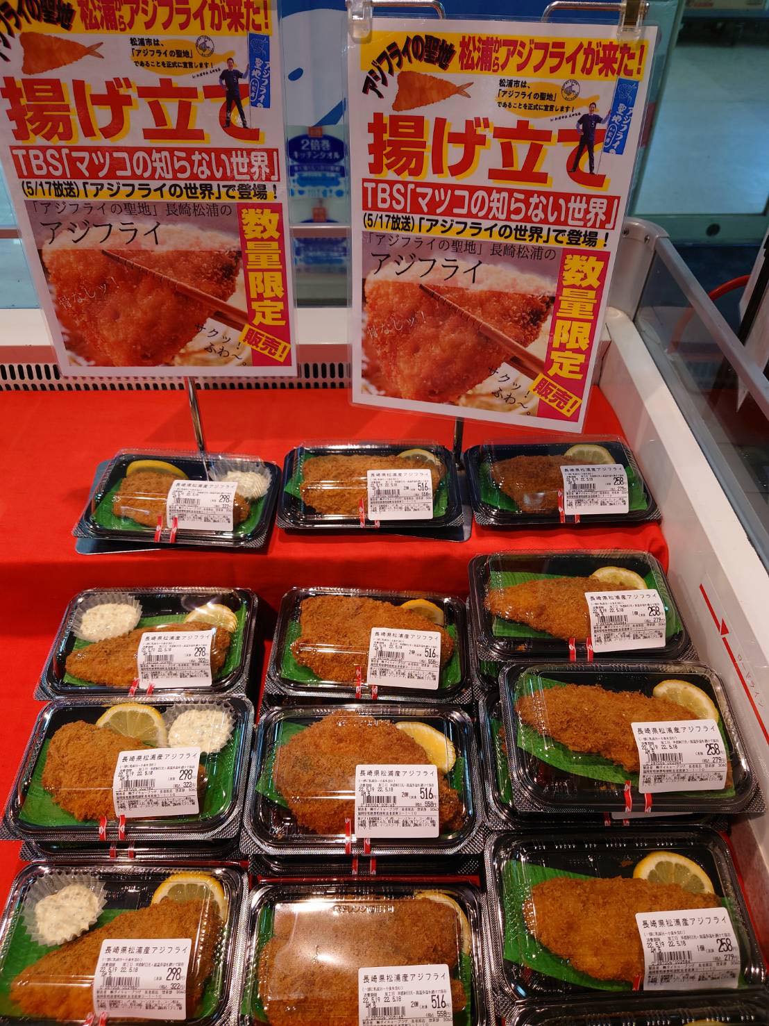 アジフライの聖地ともいわれる「長崎県松浦市」 そこからアジフライがやってきました! 揚げたてアツアツの販売です。 5月17日にマツコノ知らない世界でも紹介された松浦のアジフライ サクサク、肉厚、魚臭さもなく、これぞ最高のアジフライ。 それを求めて行列ができるほどでした。 大人気であっという間に完売。 お買い上げいただいた皆様、ありがとうございました。