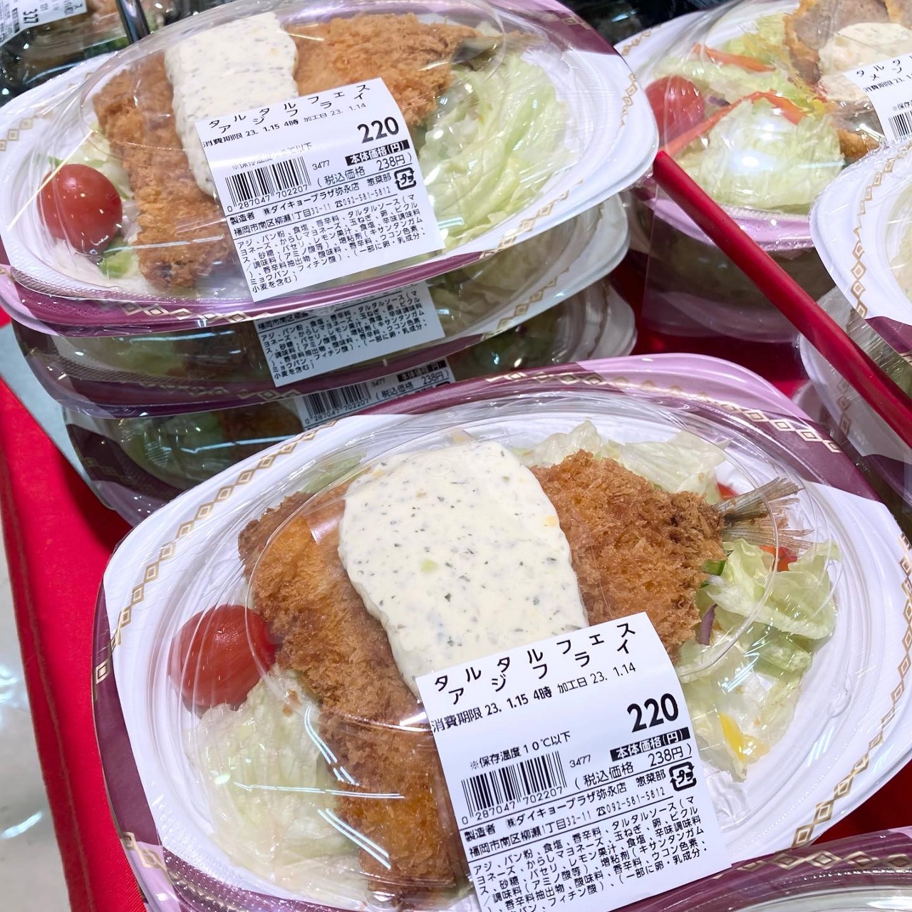 ダイキョー自家製の「食べるタルタルソース」に合わない揚げ物は存在しない! 1月14日(土)、そんな説を惣菜コーナーで検証してみました。 アジフライ・エビフライ・ヒレカツ・チキン南蛮など 人気の揚げ物に食べるタルタルソースを添付。 どのお惣菜も人気! もちろん食べるタルタルソースも人気でした!