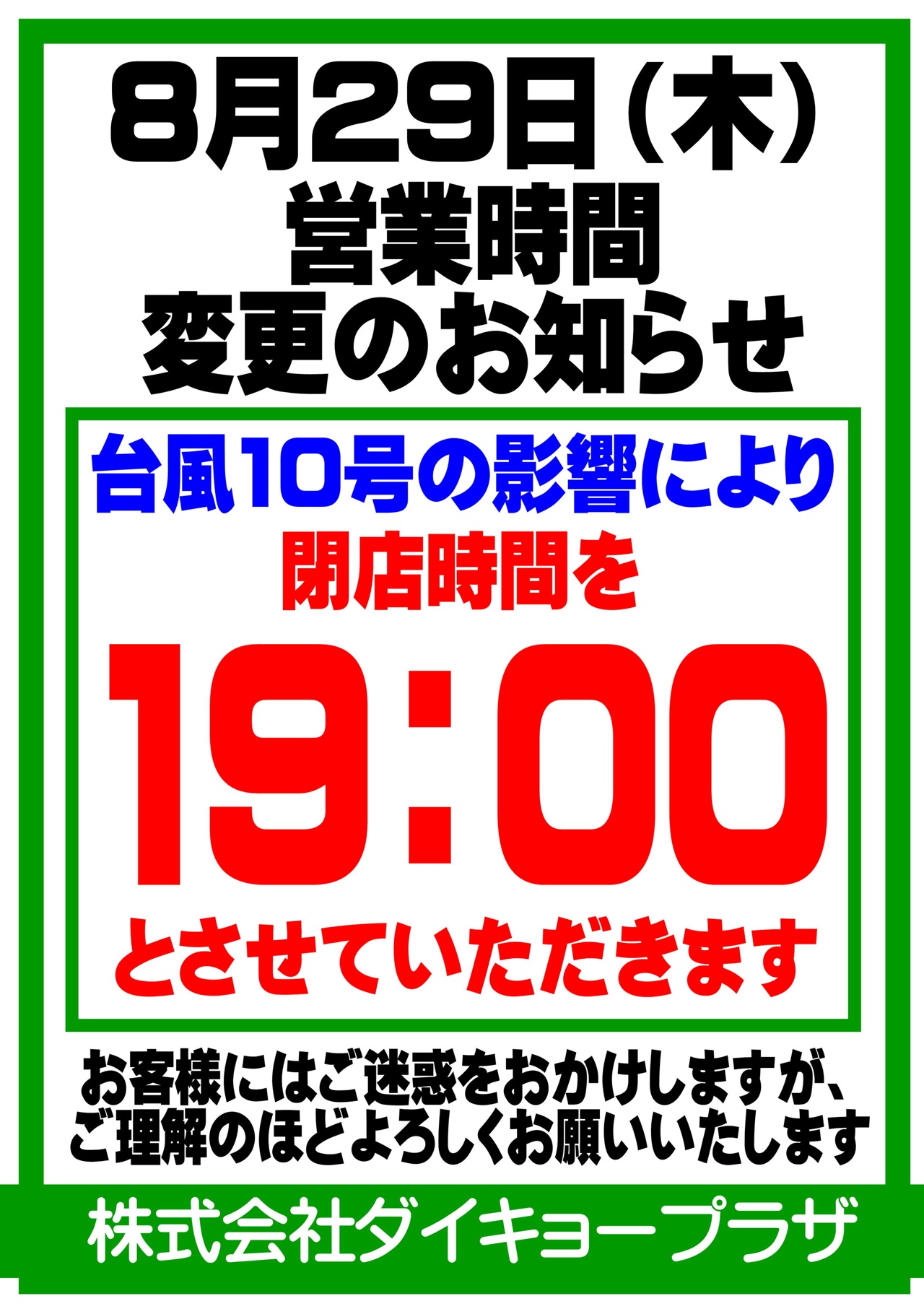 8月29日(木) 台風10号が接近してきております。 それに伴い、お客様・従業員の安全性を考慮し、閉店時間を 午後7時に変更させていただきます。 お客様には大変ご迷惑をおかけしますが、ご理解のほど、よろしくお願いいたします