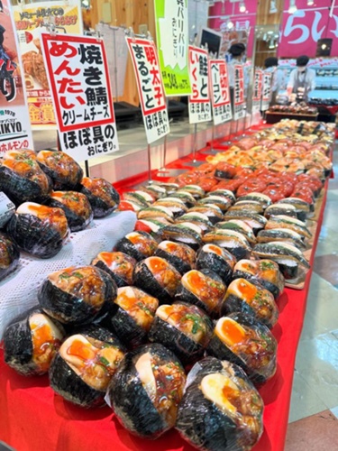 8月18日、久しぶりに登場した「具バリバリおにぎり」です 福岡を代表する鉄板焼きレストラン天神ホルモンさんとの スペシャルコラボおにぎり 「天神ホルモンバリバリおにぎり」 その他にも、うなぎ・海老天・鮭いくら・豚角煮&煮玉子・焼き鯖明太クリームチーズ・ 明太子・スパム・ベーコンと定番のおにぎりも並びました